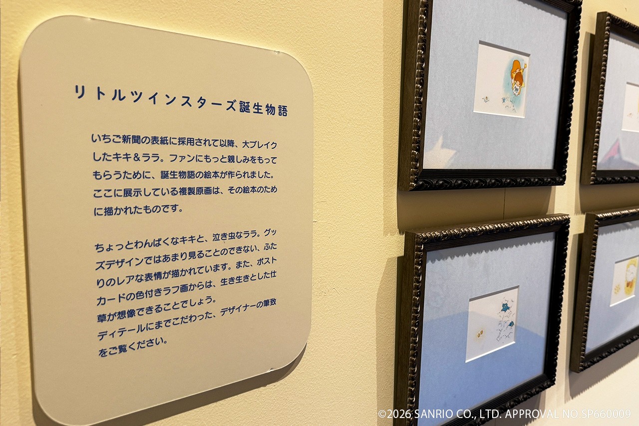 会場に足を踏み入れて最初の見どころは、初登場となるキキ&ララこと「リトルツインスターズ」の原画展示。誕生物語を彩る、原画特有の繊細かつ情緒豊かな筆致は必見。間近で見るほどに、心を揺さぶられるに違いない。