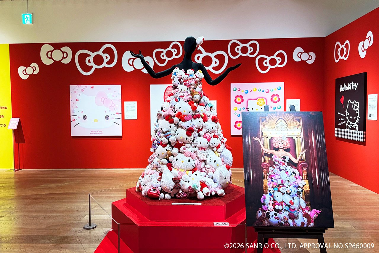 さらに奥に進むと、かつて世界的シンガーのレディー・ガガが纏い、世を驚かせた「キティドレス」のレプリカ展示が異彩を放つ。その圧倒的な造形美は、サンリオが単なるキャラクタービジネスの枠を超え、国際的なポップアイコンへと昇華した事実を物語っている。