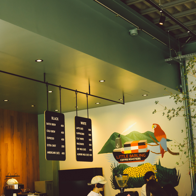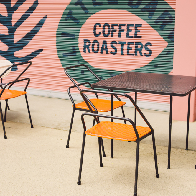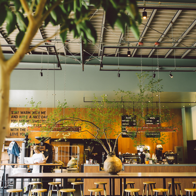 SHARE GREEN MINAMIAOYAMA内にあるコーヒーロースターズ。元倉庫をリノベーションした天高い空間と、フォトジェニックなピンクの外壁が特徴的。平日は朝8時から。