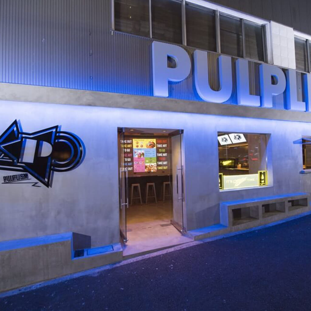 日本には提供店が少ない「プルドポークバーガー」などファーストフードのテイクアウトを中心としたパルプリズム。手作りにこだわったオリジナルサイドメニューを展開し、フードだけでなくDJブースや若手クリエイターによる作品も楽しめる空間も魅力。