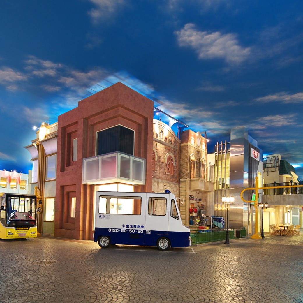 3~15歳のこども達が楽しみながら社会のしくみを学ぶことができる「こどもが主役の街」。現実社会の約3分の2のスケールで作られた街並みが広がり、警察官やパン職人など約100種類の仕事やサービスなどが体験できる。