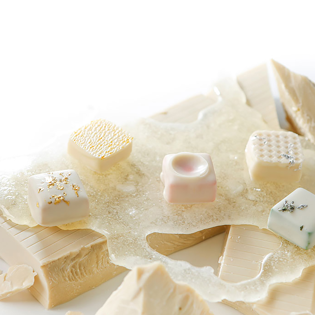 世界初ホワイトチョコレートのBean to Bar (ビーントゥーバー)ブランドショップ。全面ガラス張りで、カカオ豆からチョコレートまでの製造工程やココアバターをしぼる様子を見学できる。