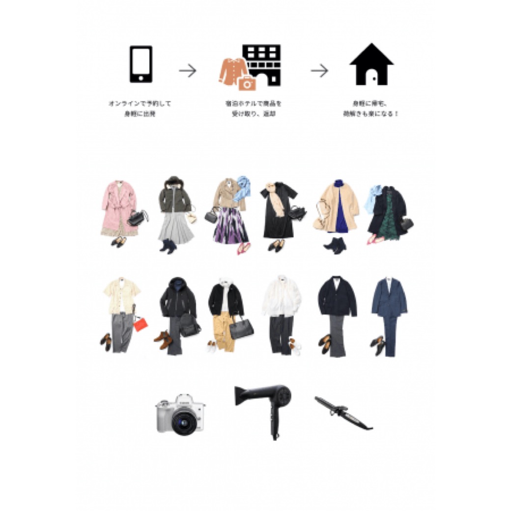 「旅先のお洒落は“全ておまかせ”で、旅行を全力で楽しむ」というコンセプトのもと生まれた新サービス。宿泊先ホテルで服のコーディネート一式やカメラをレンタルできるため、身軽に旅行を楽しむことができる。