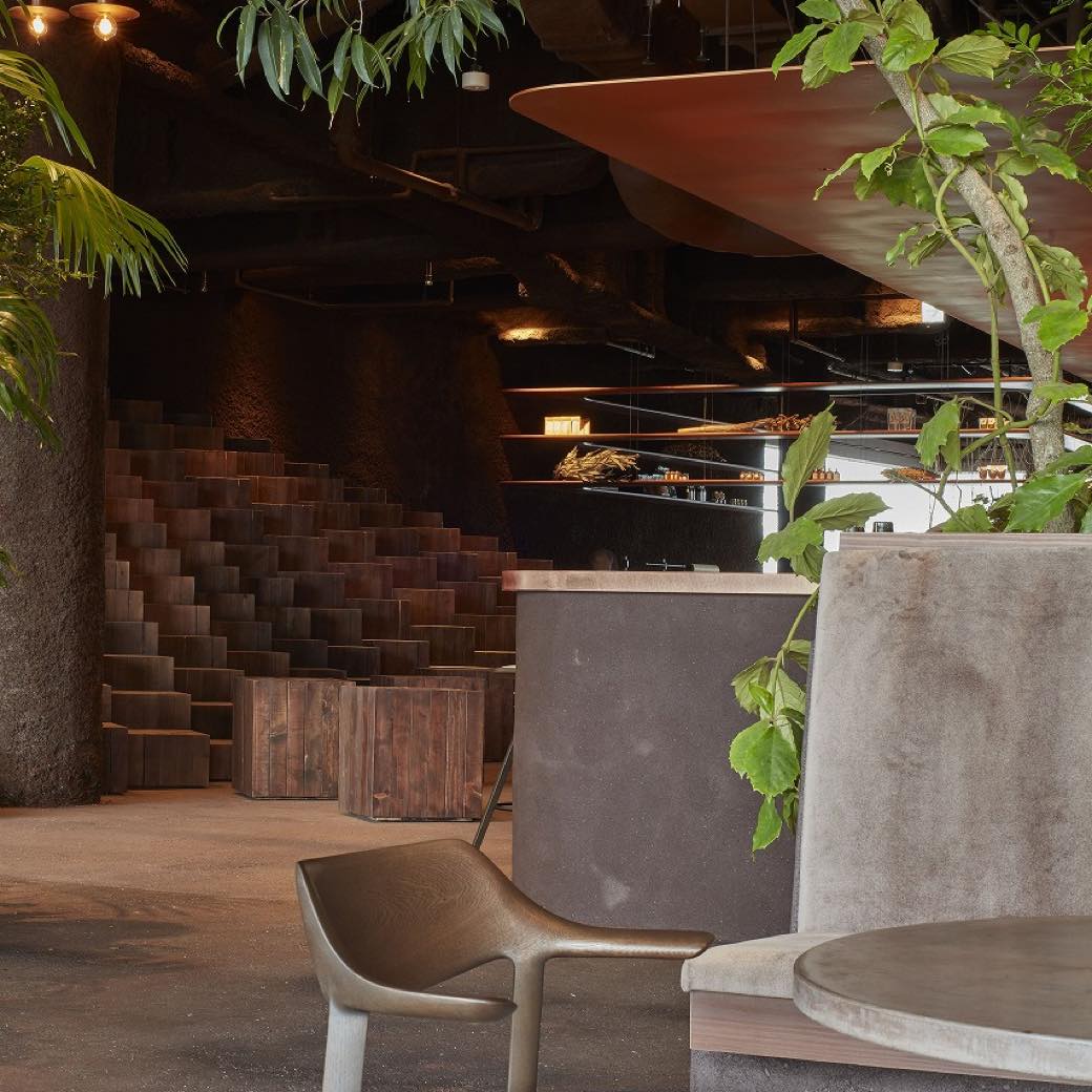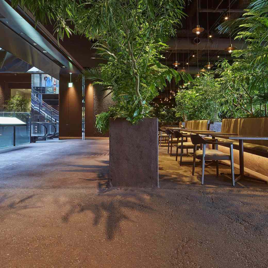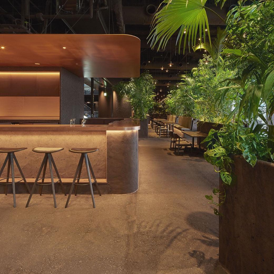 「循環」をテーマに、2020年1月にリニューアルオープンした表参道GYREのレストランフロア。食の未来を考えた4つの店とイベント・スペースで構成されている。壁や床に土を使用したほとんど仕切りのない空間で、日々の食材を肥料にするコンポストも実験的に取り入れている。