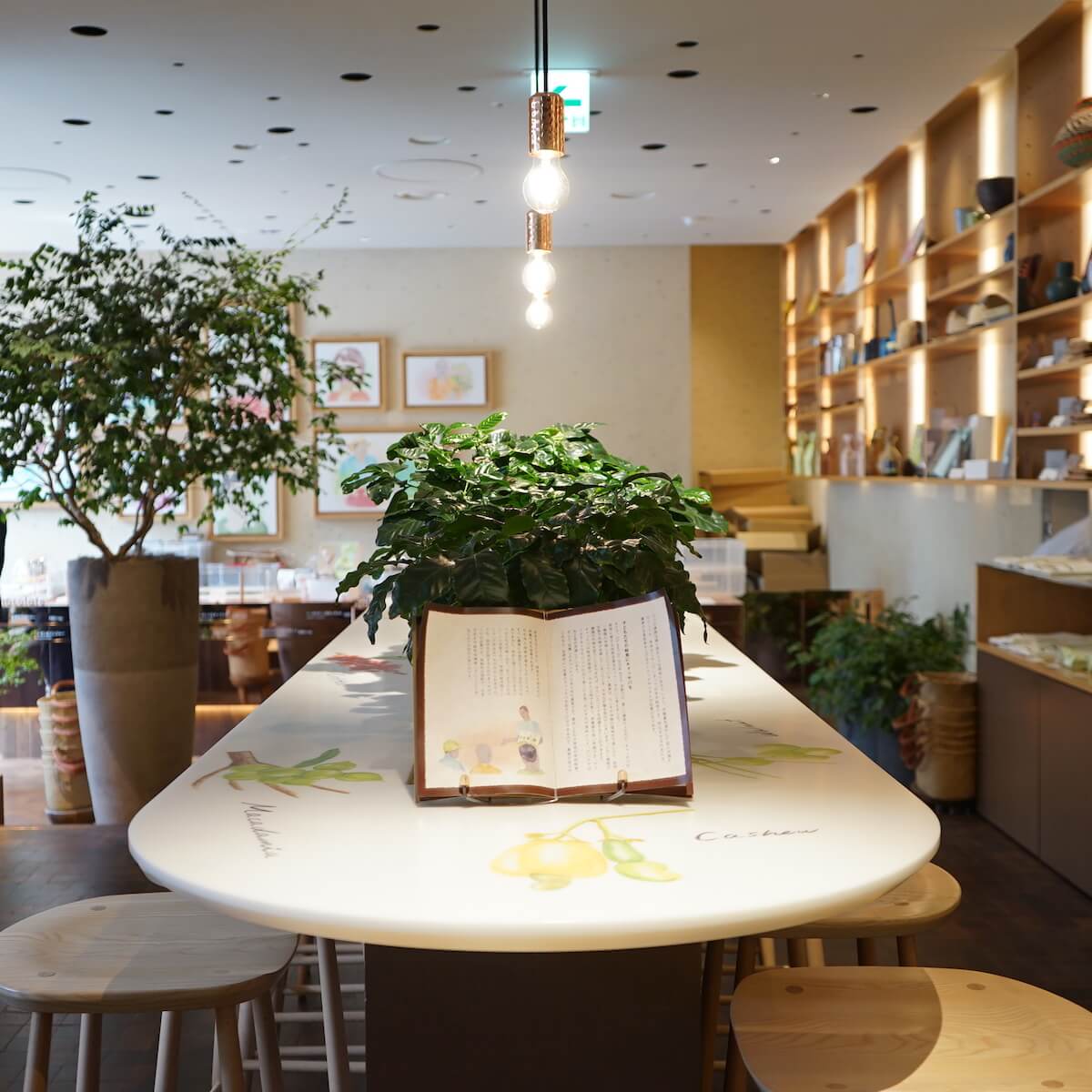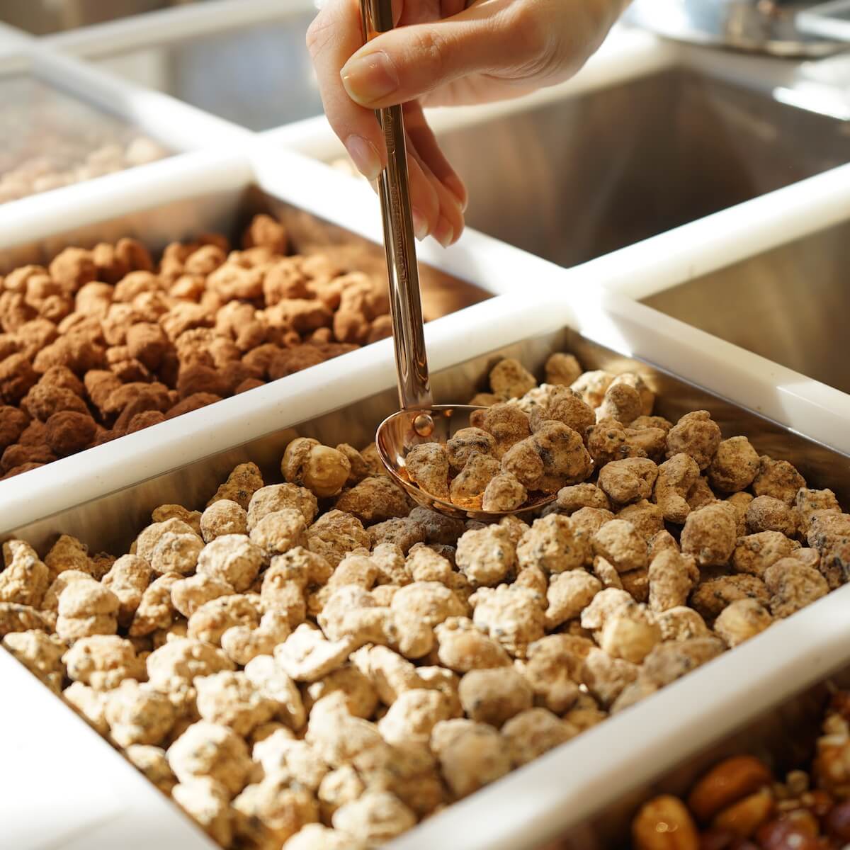 オリジナルナッツやチョコレート、コーヒーの販売を行う「Well Food & Drink(=消費者だけでなく、生産者や社会にとってWell(よい)食)」のマーケット&カフェ。日常的に利用することで、世界の農業が抱える社会的・環境的課題の解決に自然と関わることができる。