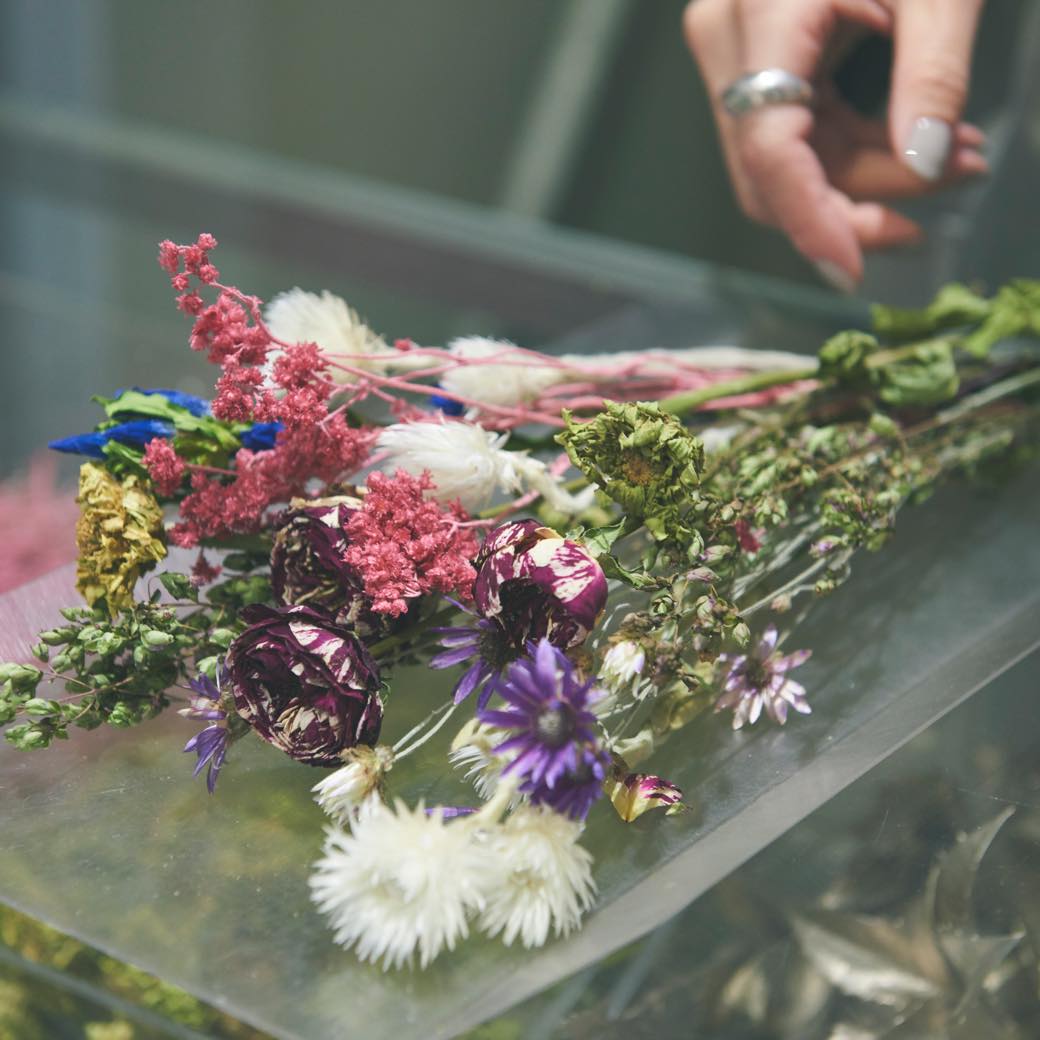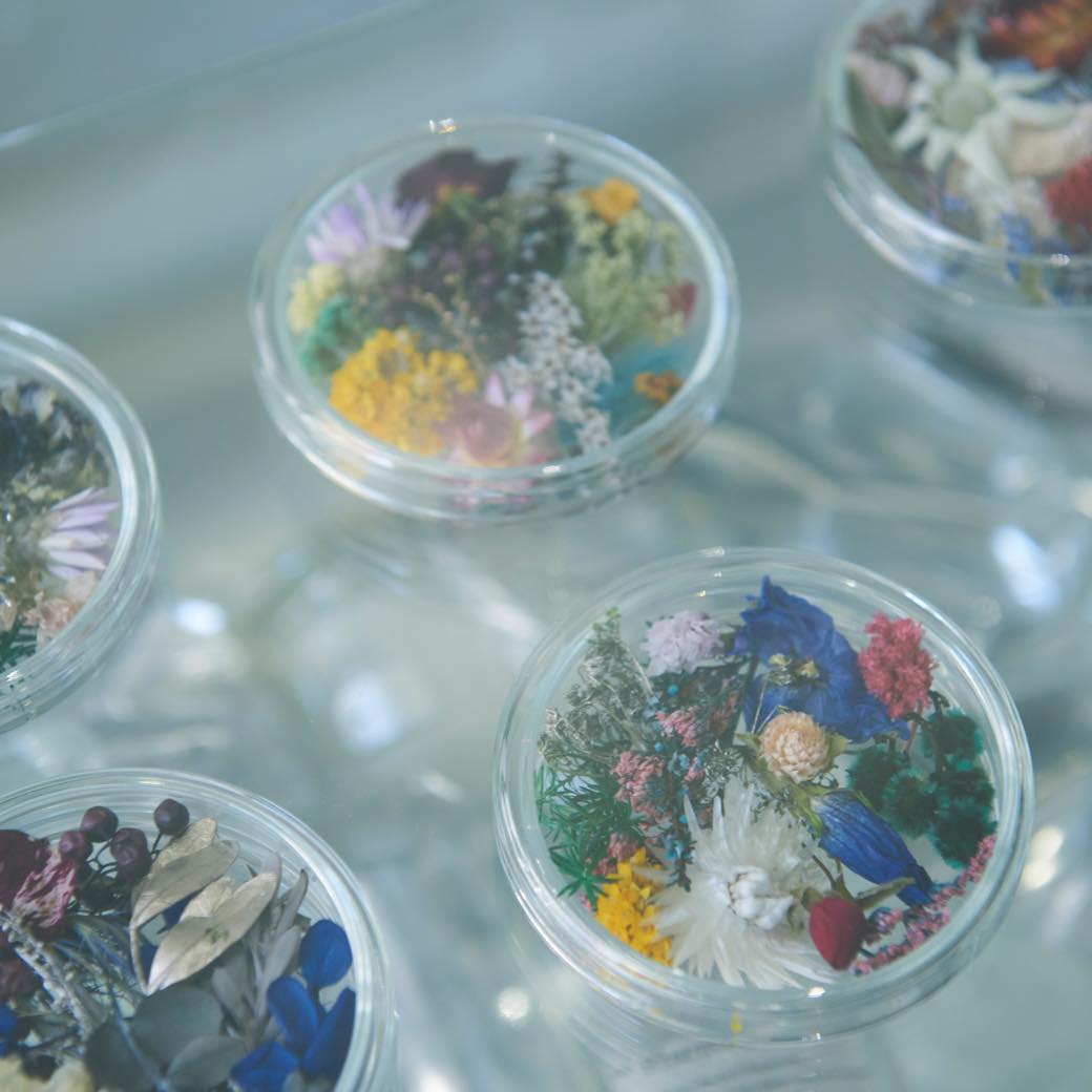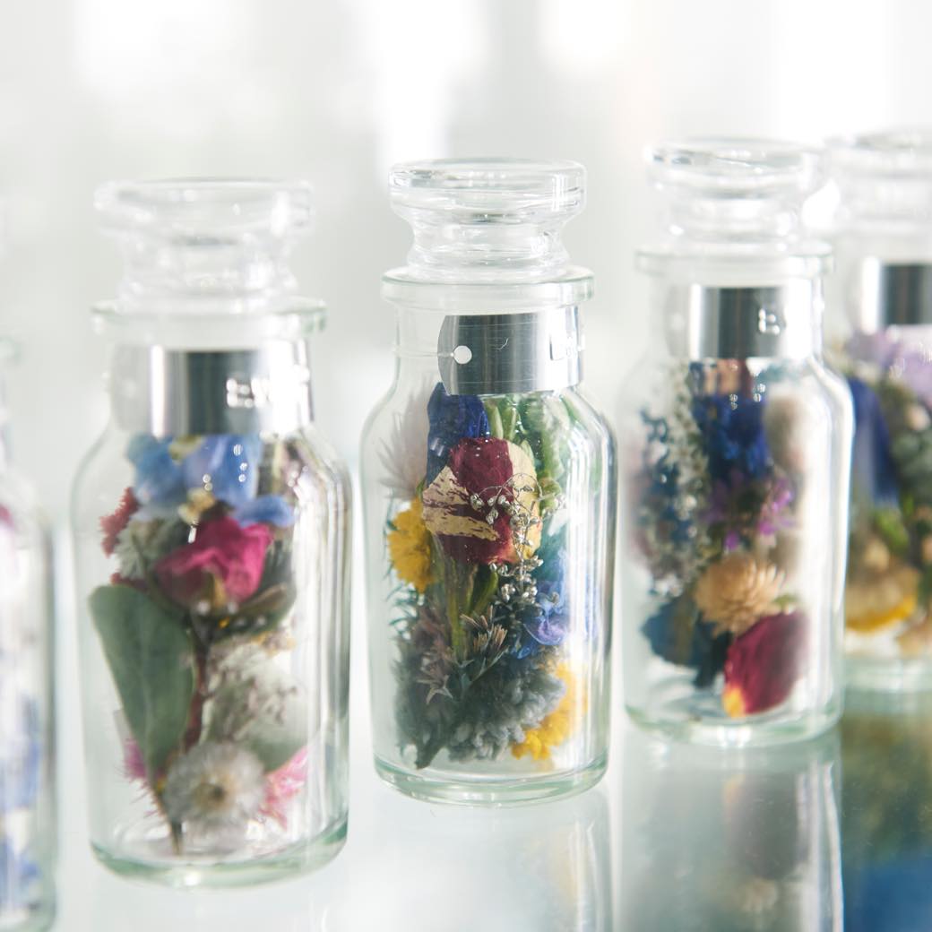 edenworksが手掛ける、調剤薬局の調合をコンセプトにしたドライフラワーショップ。好きなドライフラワーを数種類と、花を入れる袋や瓶などのパッケージを組み合わせてアレンジしてくれる。扱う花の種類は約20種類で、2ヶ月に1回入れ替わる。