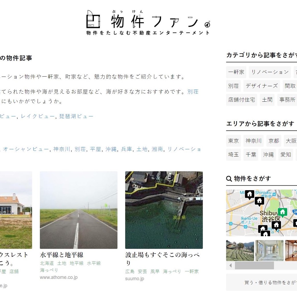 「物件ファン」は借りる・買うではなく、物件を「愛でる」ことを目的としたエンタメサイト。シンプルなデザインのこのサイトに、一般的な不動産サイトにある便利で実用的な情報は用意されていない。誰かによって語られるストーリーとシンプルな情報が、妄想を膨らませる繰り返される毎日の気晴らしに、物件ファンを眺めて”私にはない暮らし”のストーリーをはじめよう。