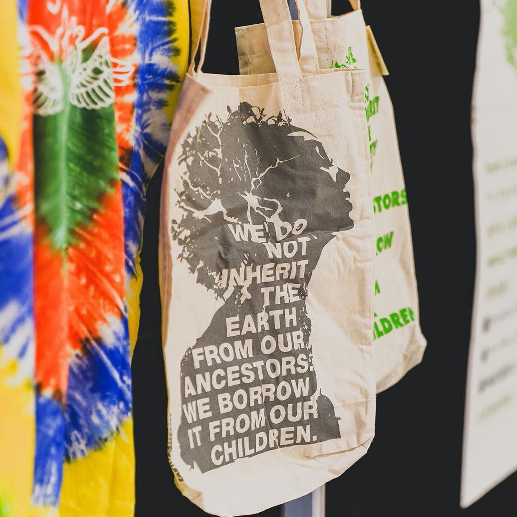 アジア太平洋地域の途上国で活動する社会起業家を支援をするNGO団体「Earth Company」のエコバッグ。バッグに書かれた英文はネイティブ・アメリカンの格言で、「この地球は、先祖から継承したのではなく、私たちの子供たち、子孫から、借りているのです」という意味である。バッグはオーガニックコットンでできており、洗濯をしてもマイクロプラスチックが出ないため、長い目で見ても環境保護につながる。