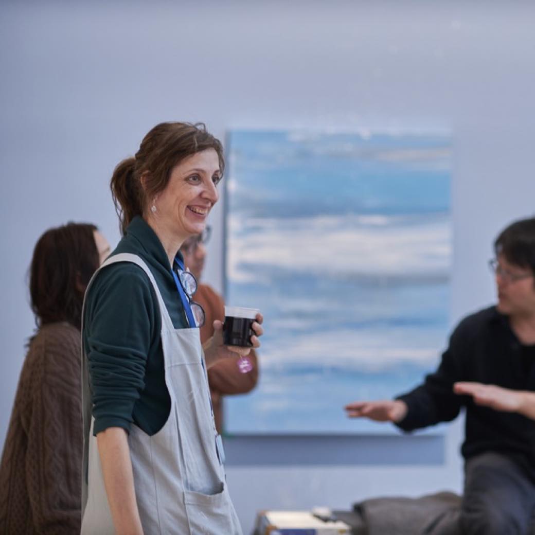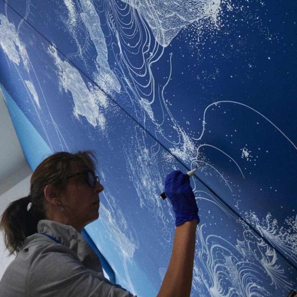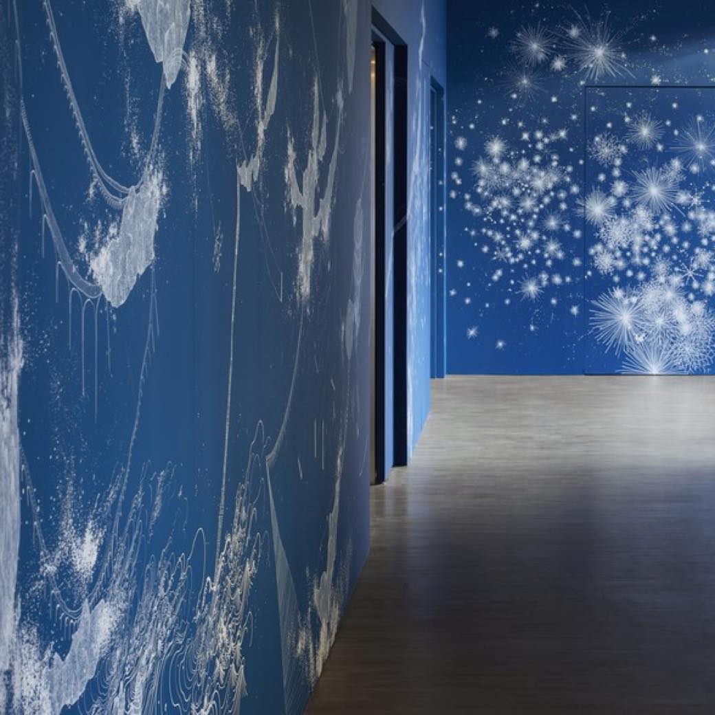 今回の展示では、宇宙を象徴的に表す青のグラデーションを使用し、水色の「朝」から紺色の「夜」へ、「時の移ろい」を体感できる空間を作り上げた。中央のキャンバス作品が起点となり、会場全体に広がるドローイングは、6人のアーティストともに2週間かけて手掛けたという。