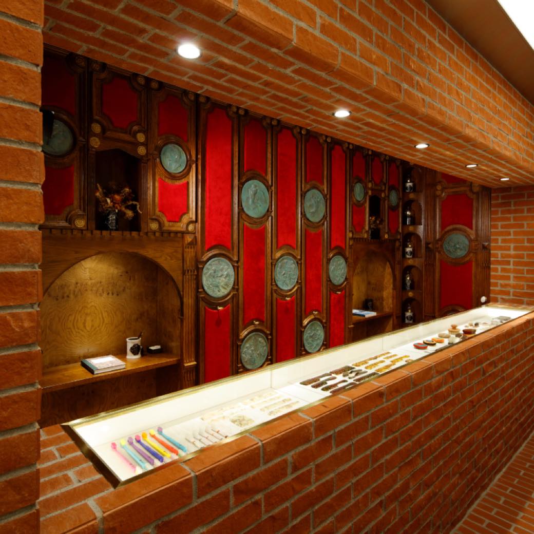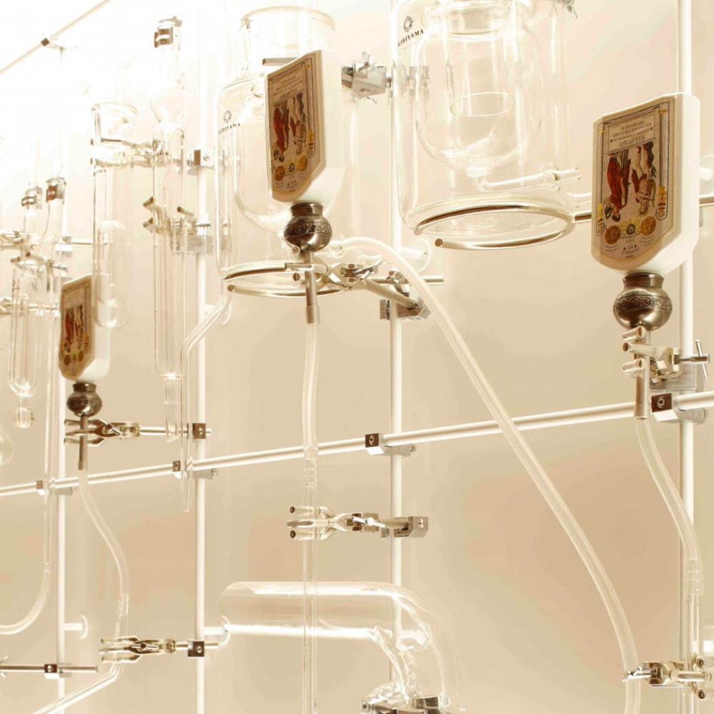 足を踏み入れると目を奪うのがピンボールゲームのように縦横無尽にディスプレイされたガラス管だ。桐山製作所による理化学研究用のガラス器具を使ったインスタレーションで、全6種のボディオイル「ユイル・アンティーク」を試すことができる。実験室の機能性を追求し生まれた造形美は、創業者のビュリー氏が憧れた日本のものづくりだという。美しい装飾や仕掛けを体感することによって心までも治癒してもらえる場所が、この青山骨董通り店ともいえよう。