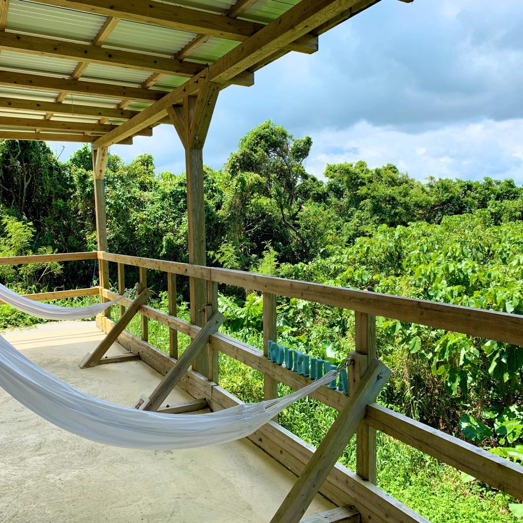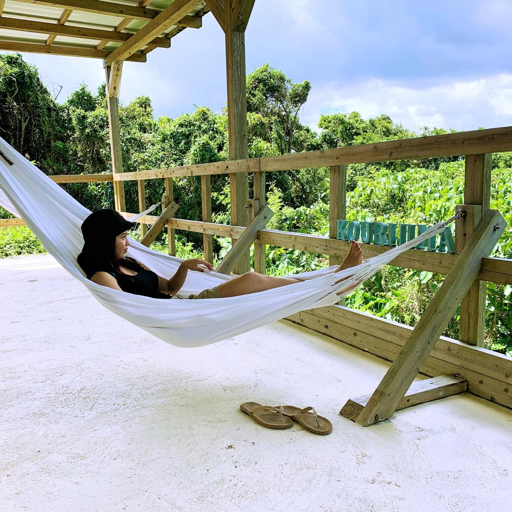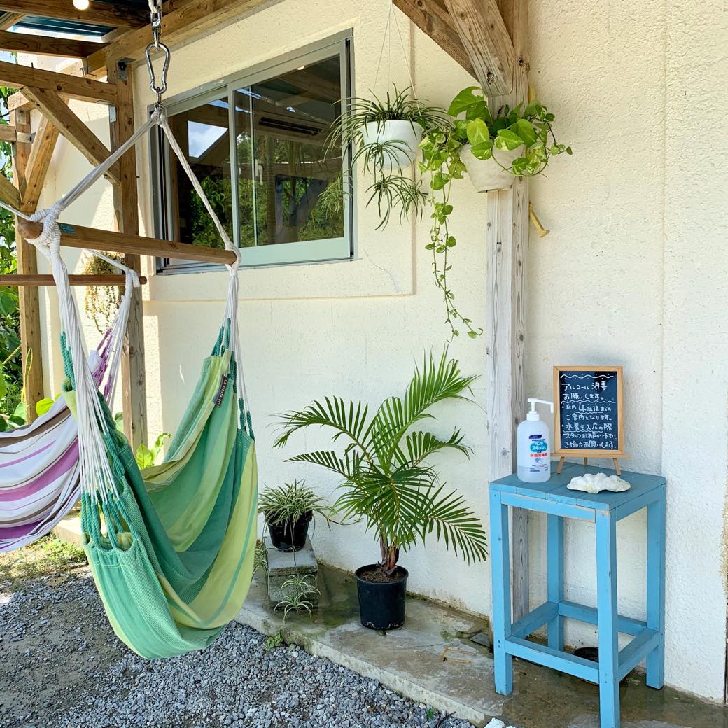 店の目玉は、ハンモック付きのテラス席。沖縄県産のアグー豚のハンバーグや、軟骨ソーキカレーといった名物料理を楽しんだあと、ハンモックに揺られながらのんびりと景色を眺めることができる。