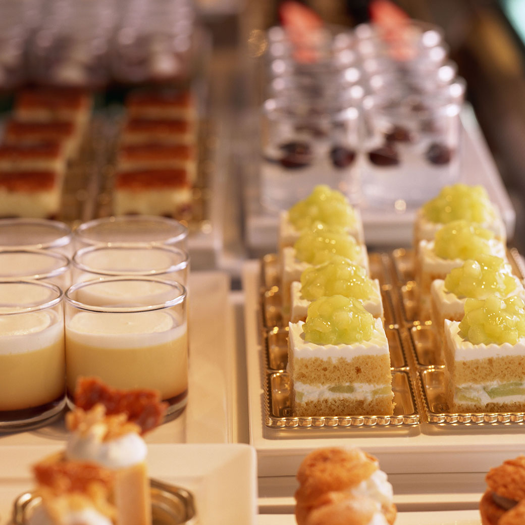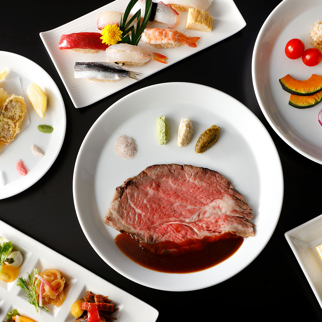 360度の展望とともに、厳撰された旬の食材が楽しめるビュッフェダイニング。店内中心部に大きく広がる「ステージキッチン」では、鉄板焼、寿司をはじめ、和・洋・中・スイーツと豊富な料理がその場で調理・提供される。