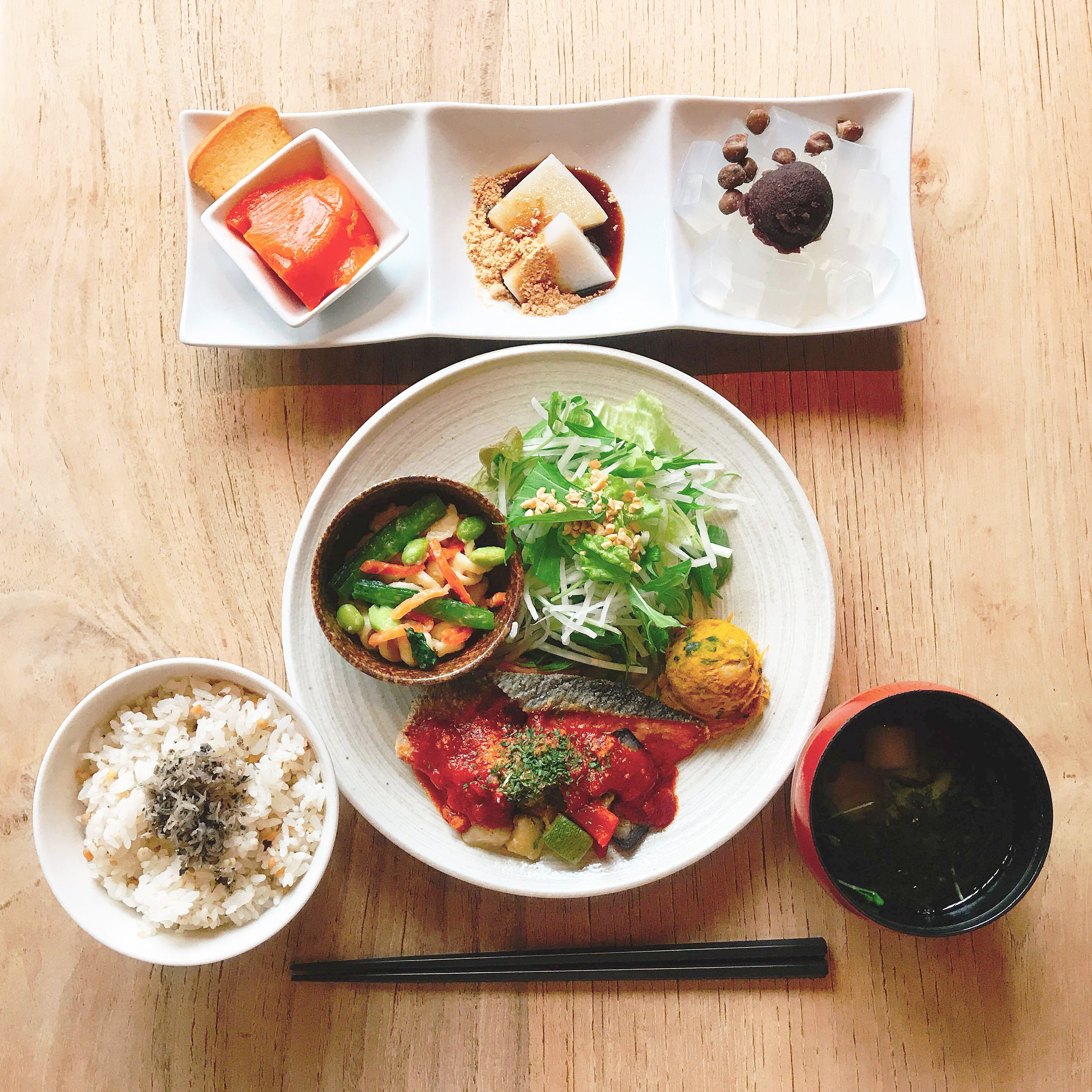 亀戸で江戸時代から続く老舗店による和カフェ。柔らかな光が漏れる優しい雰囲気の店内には、一人でも訪れやすいカウンター席やグループで楽しめるテーブル席を用意。惣菜たっぷりのヘルシーなランチが人気。夏季は人気のかき氷目当てに行列ができることも。